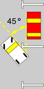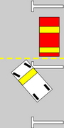 Извршимо провјеру, да ли ометамо саобраћај. Након тога контролишући брзину возила засутављамо аутомобил као на слици. Приликом паркирања гледамо кроз задњи прозор, повремено посматрамо десно огледало и пратимо размак између возила. Укосимо возило отприлике под 45 степени, наш задњи десни точак би требало да буде у линији са паркираним возилом, као што је приказано на слици.
